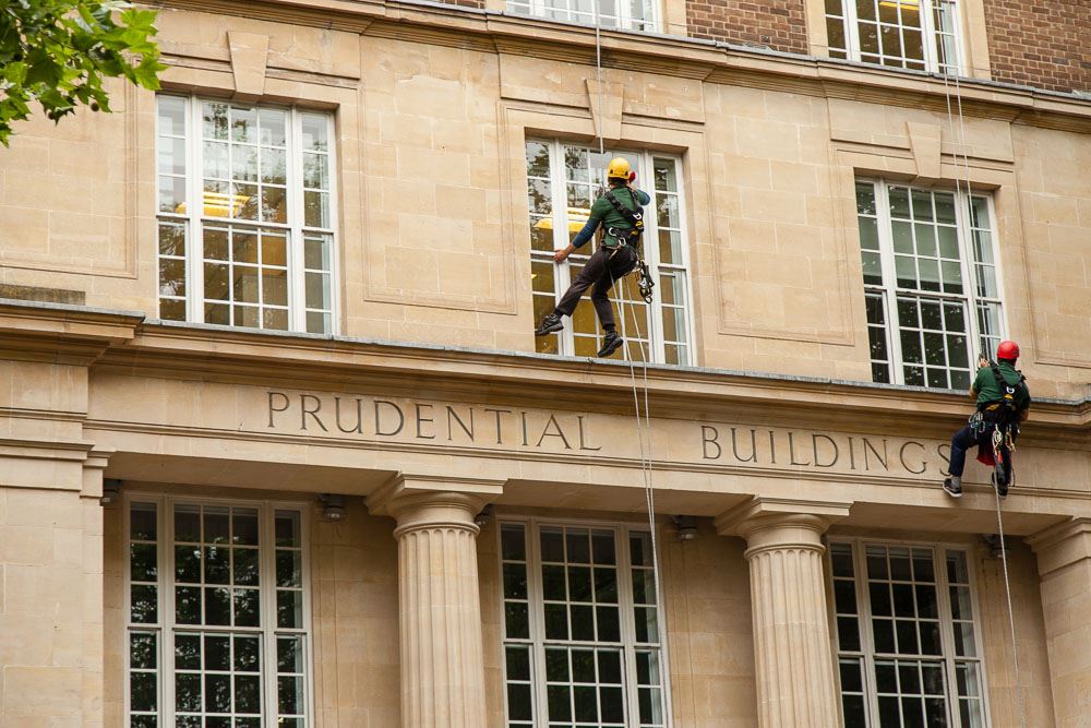 The Prudential Building is a tall building; five stories at the front, with a drop at the rear making it eight stories at the back. It was designed in the latter half of the 19th Century by the English architect Alfred Waterhouse who built 27 buildings for the Prudential Assurance Company. As with many older buildings, each window is made up of lots of small panes of glass, so if we used our Reach & Wash® system on this style of window, the water would pool on the ledge of each pane and then trickle down leaving unsightly streaks. Cleaning by hand is the therefore the best way to approach the job and we use our abseil team to access and hand clean each individual window pane and leave the windows looking sparkling clean.